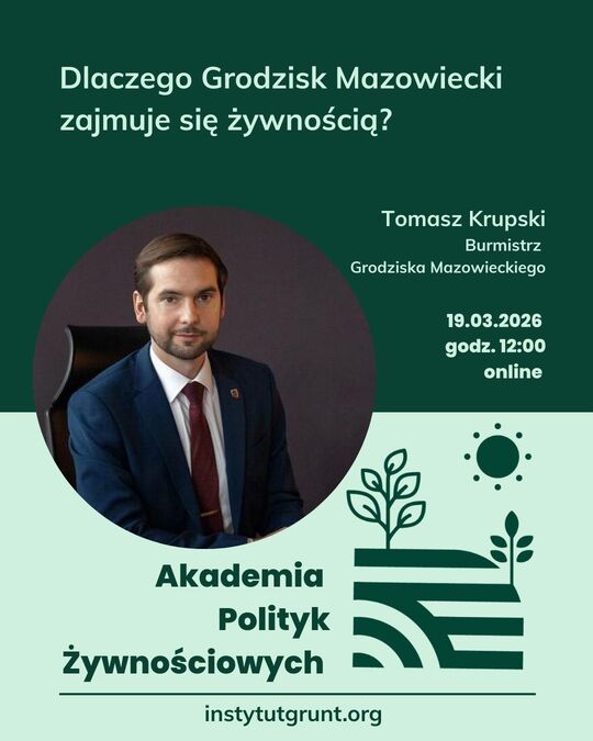 Gościem spotkania będzie Tomasz Krupski, burmistrz Grodziska Mazowieckiego, który opowie o doświadczeniach swojej gminy – położonej w sąsiedztwie dużej aglomeracji, a jednocześnie aktywnie rozwijającej inicjatywy związane z żywnością i rolnictwem. Zaprezentuje konkretne działania realizowane w gminie – gminny system żywienia, ochronę gruntów rolnych, Grodziski Festiwal Permakultury. Uczestnicy spotkania dowiedzą się, dlaczego Grodzisk Mazowiecki zdecydował się dołączyć do Koalicji Suwerenności Żywnościowej oraz po co powołał Społeczną Radę do spraw żywienia dzieci i młodzieży.
