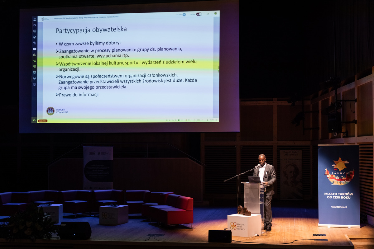 Gościem tarnowskiego seminarium był Vincent Mrimba, dyrektor Departamentu Kultury, Równości i Różnorodności Miasta Bergen. Opowiedział o tym, jak w tym drugim co do wielkości mieście Norwegii mieszkańcy włączani są we współrządzenie miastem. - Zaangażowanie obywateli jest ważne ze względów politycznych i jest naszym priorytetem. Politycy pytają o nie i je sprawdzają – mówił. – Ci mieszkańcy, którzy mają kontakt z samorządem, są obecnie bardziej zaangażowani niż kiedyś. Są też lepiej wysłuchani – dotyczy to zaangażowania w proces tworzenia, jak i organizację spotkań. Zaangażowanie jest dla miasta priorytetem.