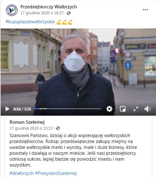 - Zakupy są najbardziej udane, gdy kupujemy to, co nam się podoba. Ale warto też mieć na uwadze wałbrzyskie marki i wyroby, małe i duże biznesy, które powstały i działają w naszym mieście. Jeśli nasi przedsiębiorcy odniosą sukces, lepiej będzie się powodzić miastu i nam wszystkim – pisze do wałbrzyszan ich prezydent Roman Szełemej.